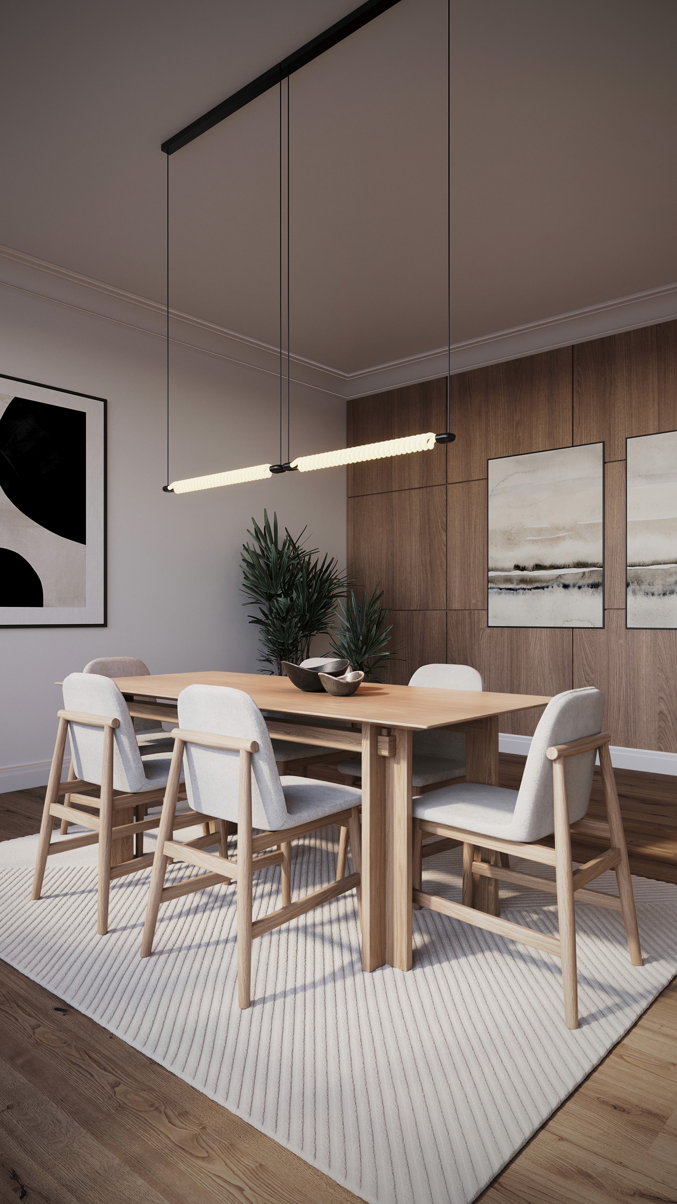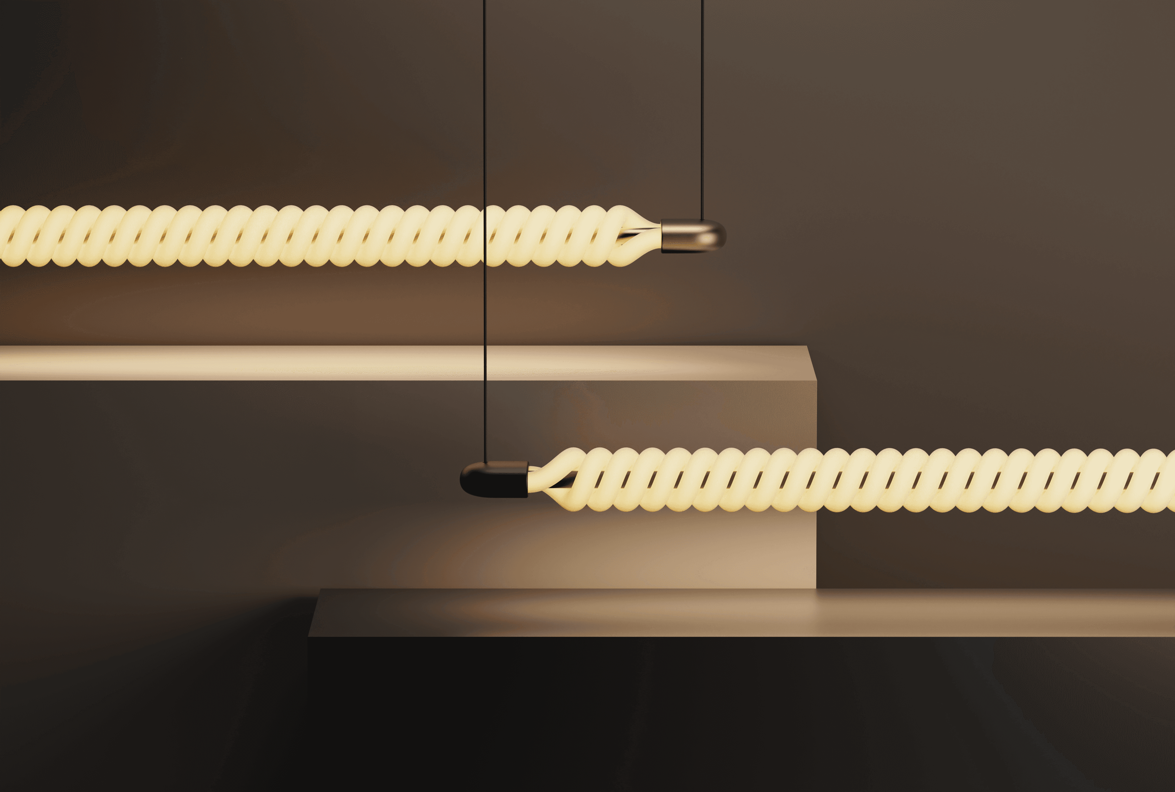 Shape two translucent tubes into a gentle helix so the light appears woven rather than merely routed. Tune proportions so the twist reads continuous from every vantage, with attachment points kept visually quiet to preserve the floating effect. Offer both horizontal and vertical suspension to shift the piece from ribbon to column with a simple reorientation.